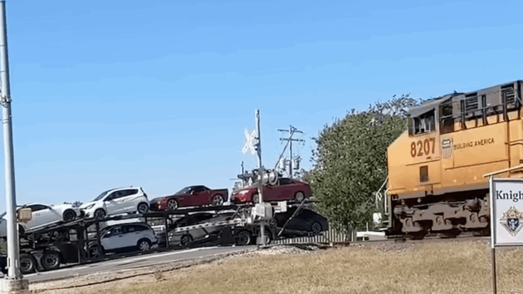 A Union Pacific freight barrels into a auto carrier at full speed in another instance of poor judgement by the truck driver. The impact was so strong that it whipped the cab of the truck backwards against the moving train,